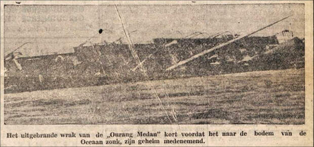 ЕДИНСТВЕННОЕ ФОТО КОРАБЛЯ, ВЗЯТОЕ ИЗ АРХИВА ГАЗЕТЫ. ПОД ФОТОГРАФИЕЙ НАПИСАНО НА НИДЕРЛАНДСКОМ: "ОБГОРЕВШИЕ ОБЛОМКИ OURANG MEDAN НЕЗАДОЛГО ДО ТОГО, КАК ОН ЗАТОНУЛ НА ДНО ОКЕАНА, УНЕСЯ С СОБОЙ СВОЮ ТАЙНУ". ФОТО: СКРИНШОТ АРХИВНОЙ ВЕРСИИ ГАЗЕТЫ DE LOCOMOTIEF 03.02.1948 С САЙТА DELPHER.NL