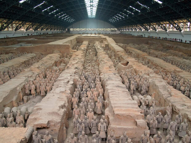 Ответ был найден после того, как близ города Линтонг крестьяне, копая колодец, случайно наткнулись на фигуры воинов и лошадей. Эта находка позволила археологам обнаружить около 8 000 тысяч глиняных терракотовых изваяний в полный рост, захороненных рядом с гробницей китайского императора Цинь Шихуанди, умершего в 210 году до н.э. Эта армия и должна была сопровождать императора в Царстве Теней. Все фигуры — пехотинцы, лучники, стрелки, кавалеристы, лошади, колесницы — были выстроены в строгом боевом порядке. В руках у воинов настоящее оружие — копья, луки, стрелы. Уздечки у коней выполнены из бронзы.