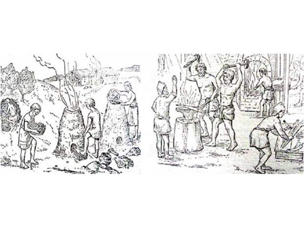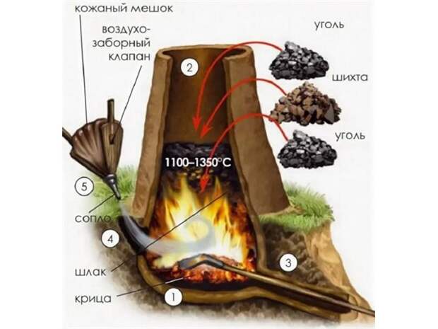 Уже начинаете догадываться, в чём тут дело, да? Тысячу лет назад в Европе железо интересовало людей прежде всего в качестве материала для изготовления оружия и орудий труда. Им были нужны мечи, топоры, ножи, лопаты, косы, вилы, серпы – да всего не перечислить! И ковали всё это кузнецы из так называемого кричного, или губчатого железа. Мастера-железоделы сперва лепили из глины горн (сыродутную печь). Затем заполняли горн железной рудой и древесным углем, уголь поджигали и начинали нагнетать мехами внутрь горна воздух.