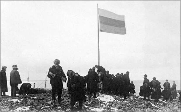 Русский национальный флаг поднят на Земле Императора Николая II. На переднем плане командиры судов - Б.А. Вилькицкий и П.А. Новопашенный Фото: