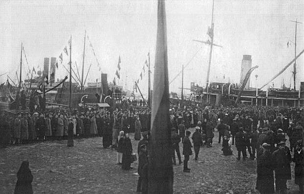 Подходят группы учащихся, которые выстраиваются шпалерами на пристани. Прибывает губернское военное и гражданское начальство, представители города и различных общественных организаций.