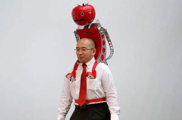 Им оказался восьмикилограммовый робот, чья задача заключается в том, чтобы сидеть на плечах у своего хозяина и кормить его помидорами во время пробежки. Помидоры (до семи штук) складываются в специальные ячейки на спине робота.