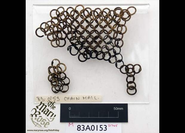 Кусок кольчуги. Следовательно, на момент гибели на «Мэри Роуз» ещё были люди, носившие кольчуги! Музей «Мэри Роуз»