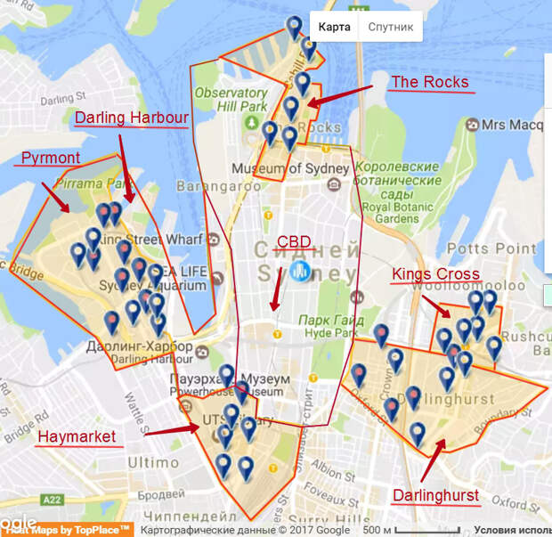 Наибольшее количество отелей сконцентрировано в центре Сиднея, который можно разделить на следующие районы: