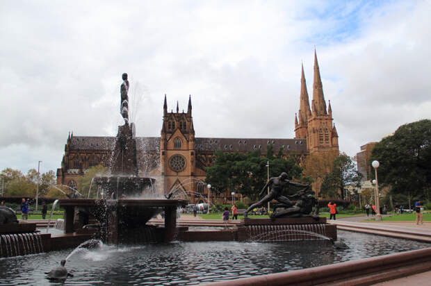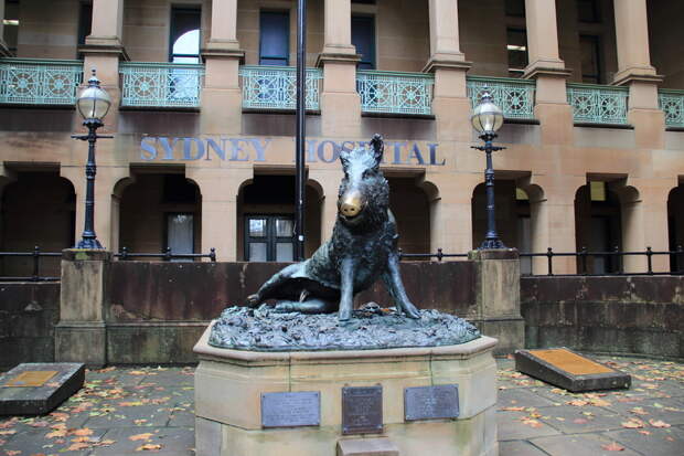 - 11:00. Если вы, как экономный человек предпочли автобус, выходите возле Hyde Park.Идем в сторону Ботанических садов, любуясь по пути огромным неоготическим St Mary's Cathedral. Неплохо прихватить ланч-бокс в каком-либо магазине или пекарне. Кстати, неподалеку имеется хорошая пекарня Flour and Stone. Наш путь проходит по исторической улице Macquarie streetсо всеми ее памятниками. Обратите внимание на статую кабана возле Сиднейского госпиталя. Если вы бывали во Флоренции, то сразу узнаете Porcellino, это его австралийский брат-близнец. Стоит заскочить на минутку и в Государственную библиотеку Нового Южного Уэльса, чтобы полюбоваться огромной картой во внушительном вестибюле главного входа.