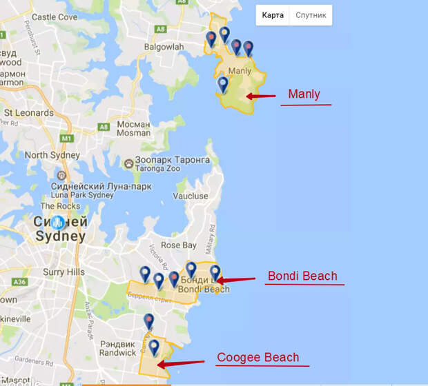 - 9:30.После неспешной прогулки, мы попадаем на пляж Bronte Beach. Если погода позволяет, можно освежиться в бесплатном бассейне с морской водой или окунуться в океан. Далее садимся на автобус либо такси и едем в центр.
