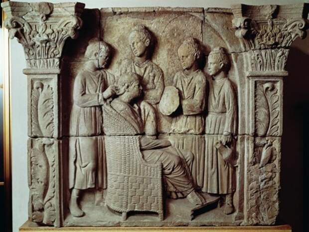 Состоятельная римлянка делает причёску в салоне красоты. Барельеф II века.