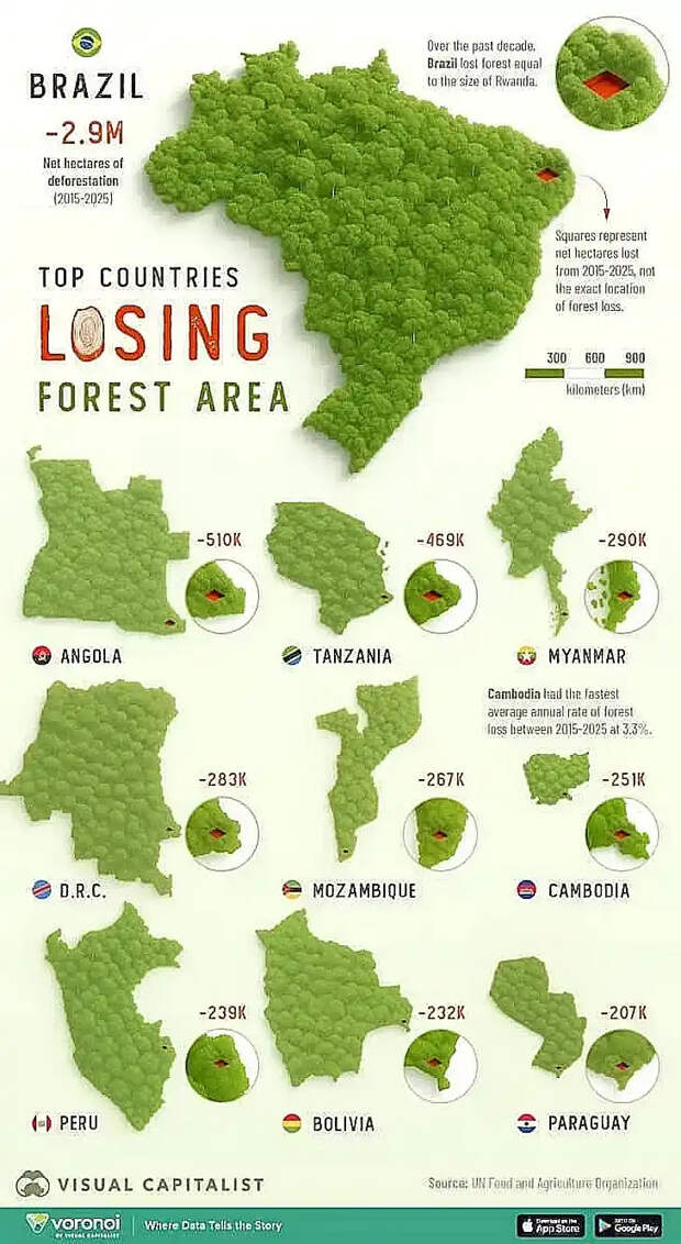 Эта инфографика показывает страны, которые потеряли больше всего лесов с 2015 года, по данным Продовольственной и сельскохозяйственной организации ООН (ФАО). С утратой более 2,9 миллионов гектар Бразилия опережает все остальные страны по масштабам обезлесения с большим отрывом.